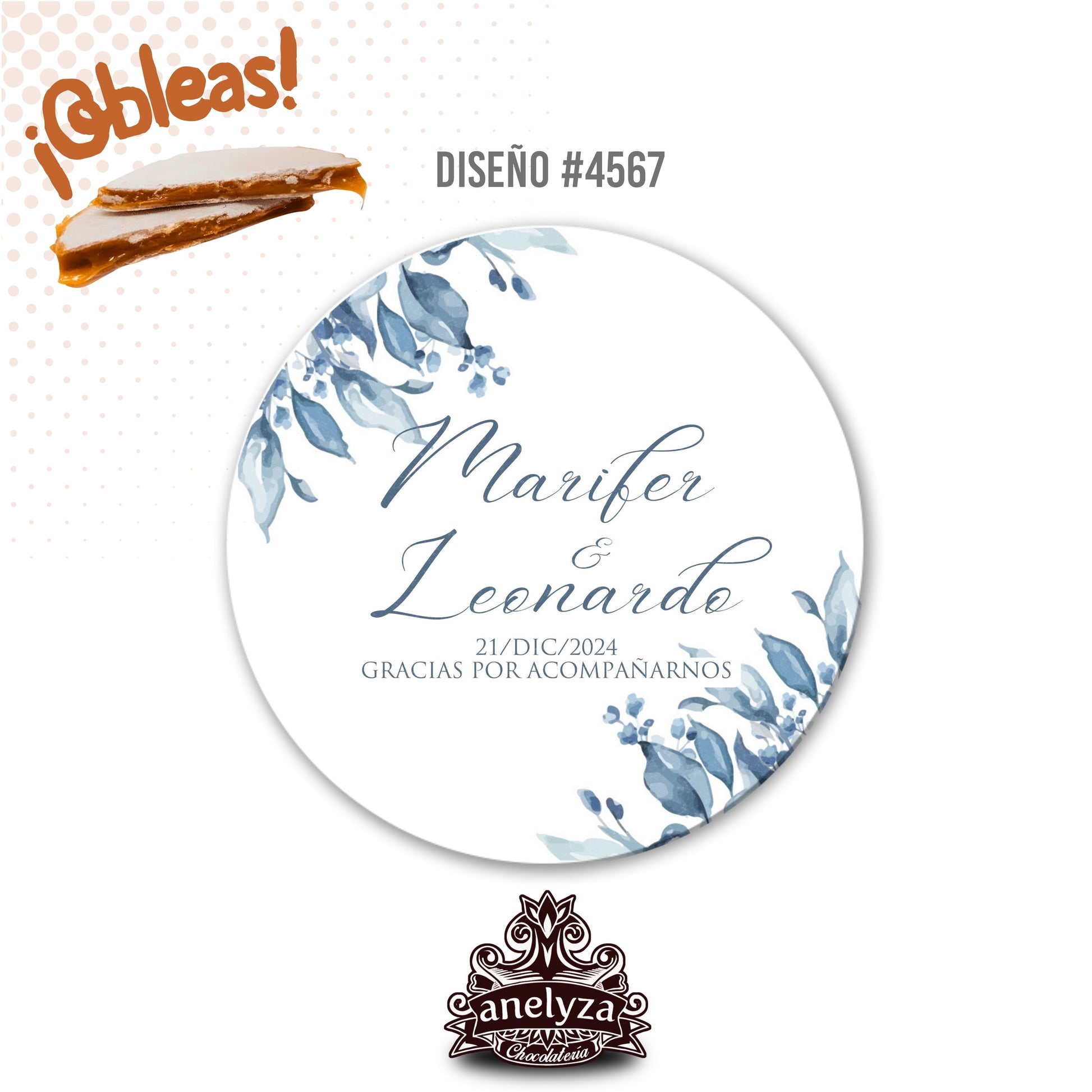 OBLEAS RELLENAS PERSONALIZADAS DISEÑO #4567 FLORES AZULES BODAS