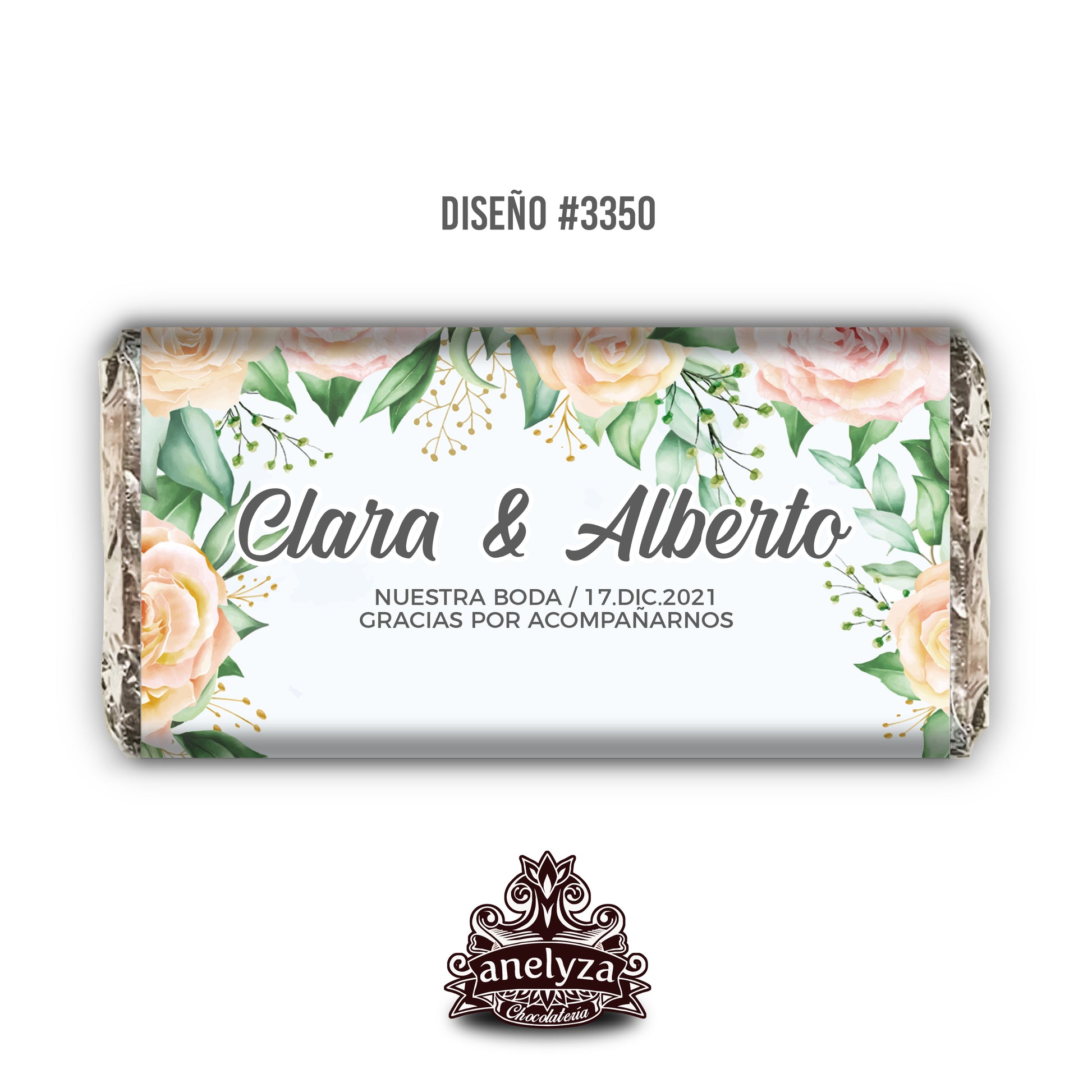 BARRAS DE CHOCOLATE PERSONALIZADAS DISEÑO #3350 ROSAS CON HOJAS VERDES BODAS